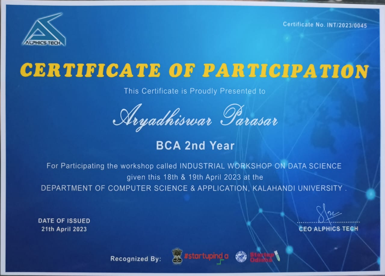 - Attended a workshop on Data Science by Alphic Tech company and learned about data analysis and machine learning techniques.